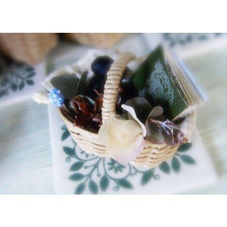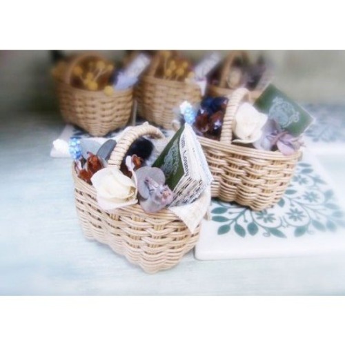 手作りのカゴに手作りのミニブック、ブリザーブドフラワーなどがアレンジされています。