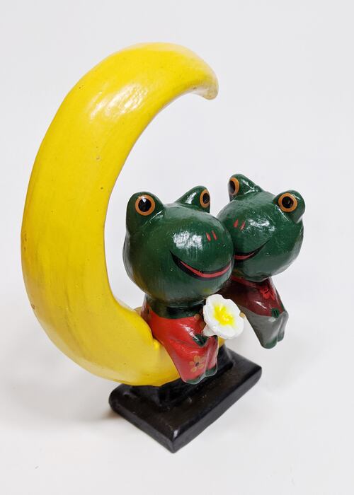 お月様に腰掛けるロマンチックカエルペア。 手作業のためムラ、ユガミなどがございます。 予めご了承くださいますようお願い申し上げます。 約13x14x4cm インドネシア