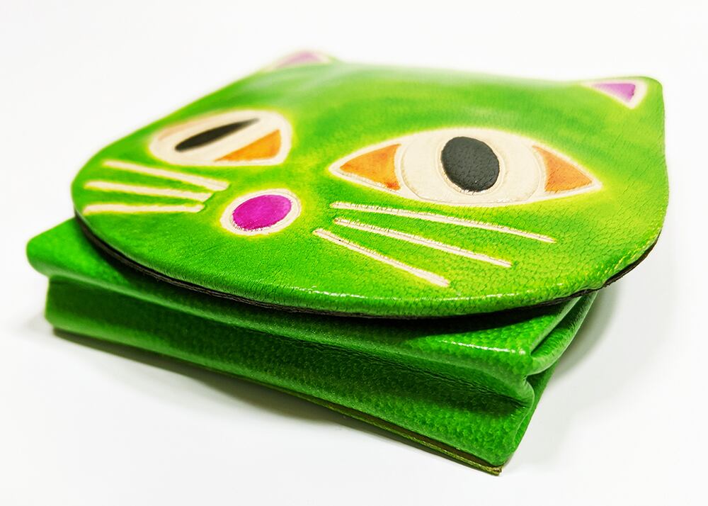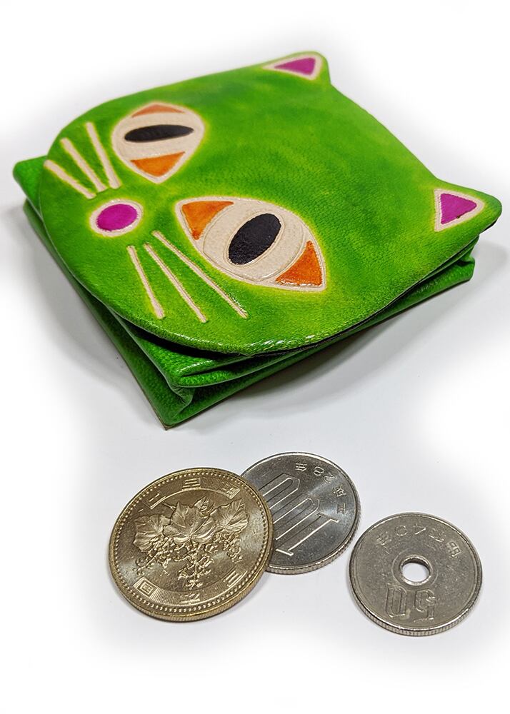 小銭入れミニポーチ 猫パース ネコ黄緑 ヤンピー インドレザー