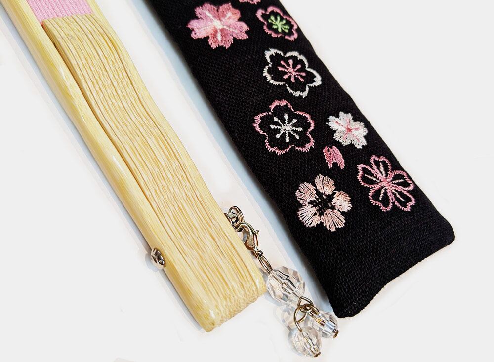 華やぎのあるピンク色の生地に刺繍の桜を重ねた扇子と扇子袋のセット。