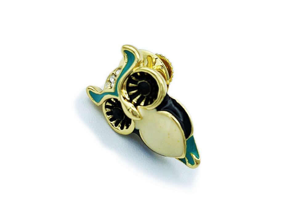 綺麗で清潔感のあるホワイトゴールドのふくろうタックピン。黒い大きな目が印象的。