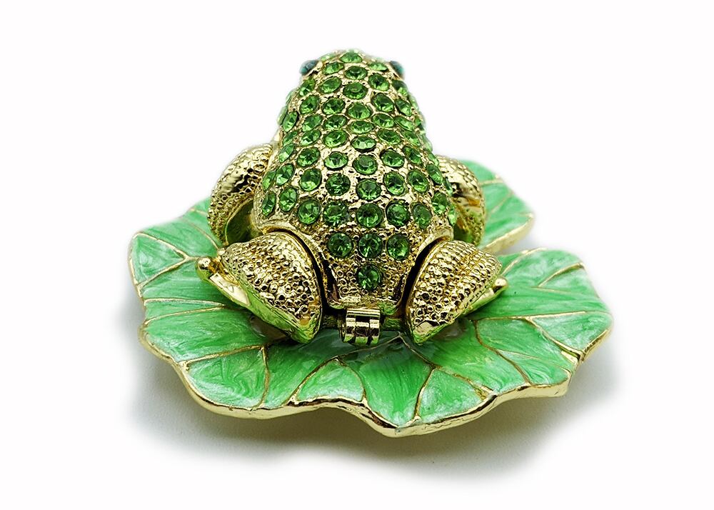 952 エナメルボックス蛙緑 約30x60x60mm ラインストーン made in china 化粧箱入 キラキララインストーンのカエルアクセサリーケース。 マグネット開閉式