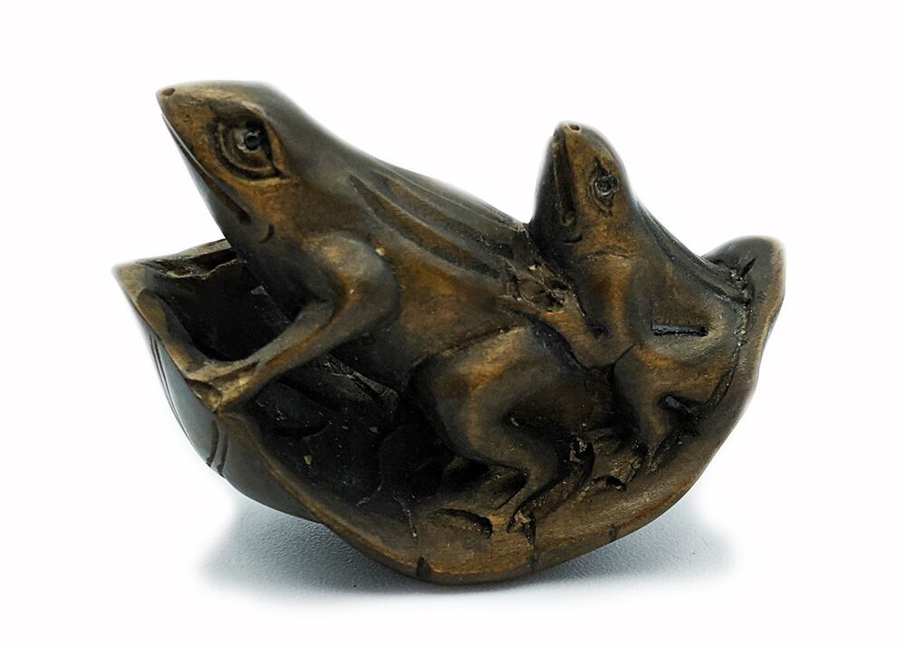 拓殖木彫蛙 根付けトップ 葉っぱ舟2匹カエル